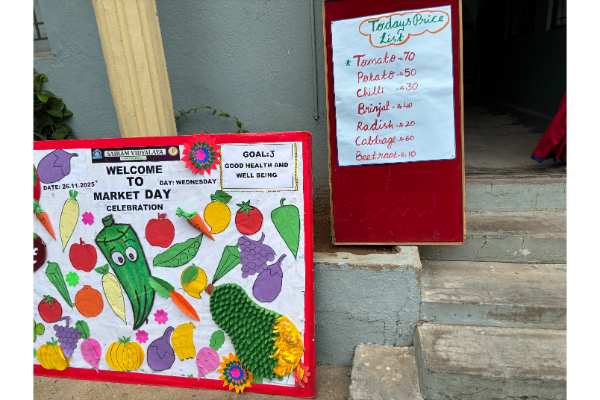 Children had a fun filled experience of selling and buying vegetables and fruits from their peers. They were excited using the weighing scale and pretending to be vegetable and fruit vendors and buyers. It created an awareness about the importance and consumption of fruits and vegetables in regular diet. This occasion was used to reinforce the concept of the healthy benefits of fruits and vegetables.